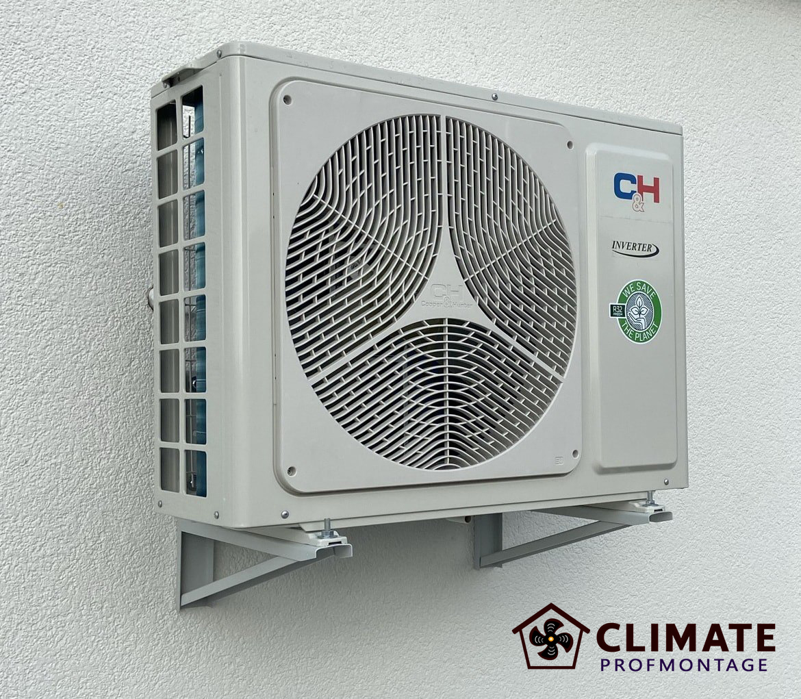 Монтаж відбувається з вікна. Майстер обов’язково фіксується страхувальним тросом і працює з дотриманням техніки безпеки. Зовнішній блок акуратно подається з вікна вліво або вправо до місця встановлення та закріплюється на заздалегідь підготовлених кронштейнах.